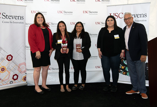 - The five USC teams who won $57,500 in cash and in-kind awards at the 2019 USC Stevens Student Innovator Showcase are pictured here with Jennifer Dyer (Executive Director, USC Stevens Center for Innovation).